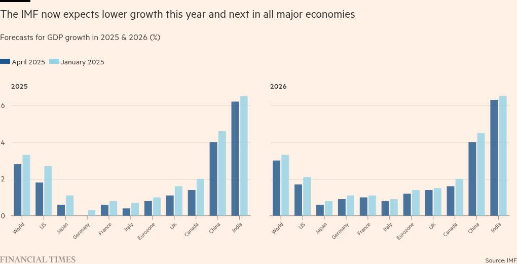 The IMF has cut its outlook for global growth by half a point to 2.8 per cent this year and trimmed its prediction for 2026 to 3 per cent. This is a slowdown from 2024’s rate of 3.3 per cent, as the IMF warns of the “major negative shock” of rising trade barriers.