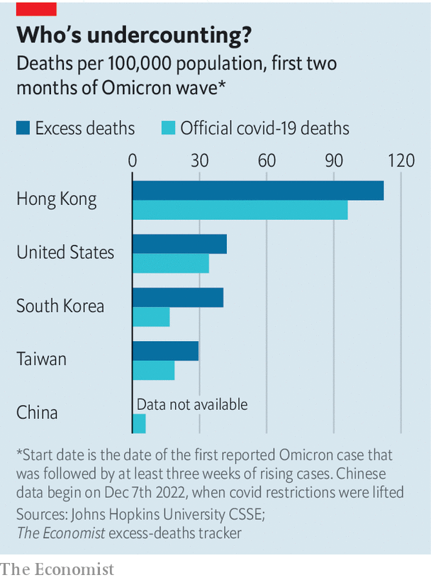 China has said it will eventually release an estimate of “excess deaths”: the gap between how many people died during the outbreak, regardless of cause, and how many deaths would have been expected otherwise. That would, in theory, take in undiagnosed covid deaths and those who died as a result of overwhelmed health services. But experts are sceptical that the number will reflect reality.