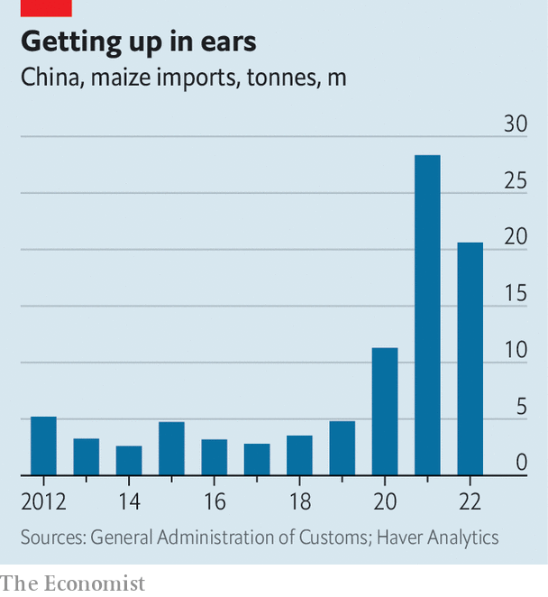 China’s aversion to GM crops is causing other problems, though. As domestic meat consumption rises, and livestock and poultry breeding expands, the demand for feed grains such as maize and soyabeans is growing. (Feed grains already account for much of the country’s total grain consumption.) More GM crops would help. According to the Food and Agriculture Organisation, an arm of the United Nations, Chinese maize yields were 6.3 tonnes per hectare in 2020, compared with 10.8 in America, where GM varieties predominate. But instead of embracing the technology, China has increased maize imports from countries such as America, Argentina, Brazil and Ukraine (see chart). That carries risks of disruption resulting from tensions with America or the war in Ukraine.