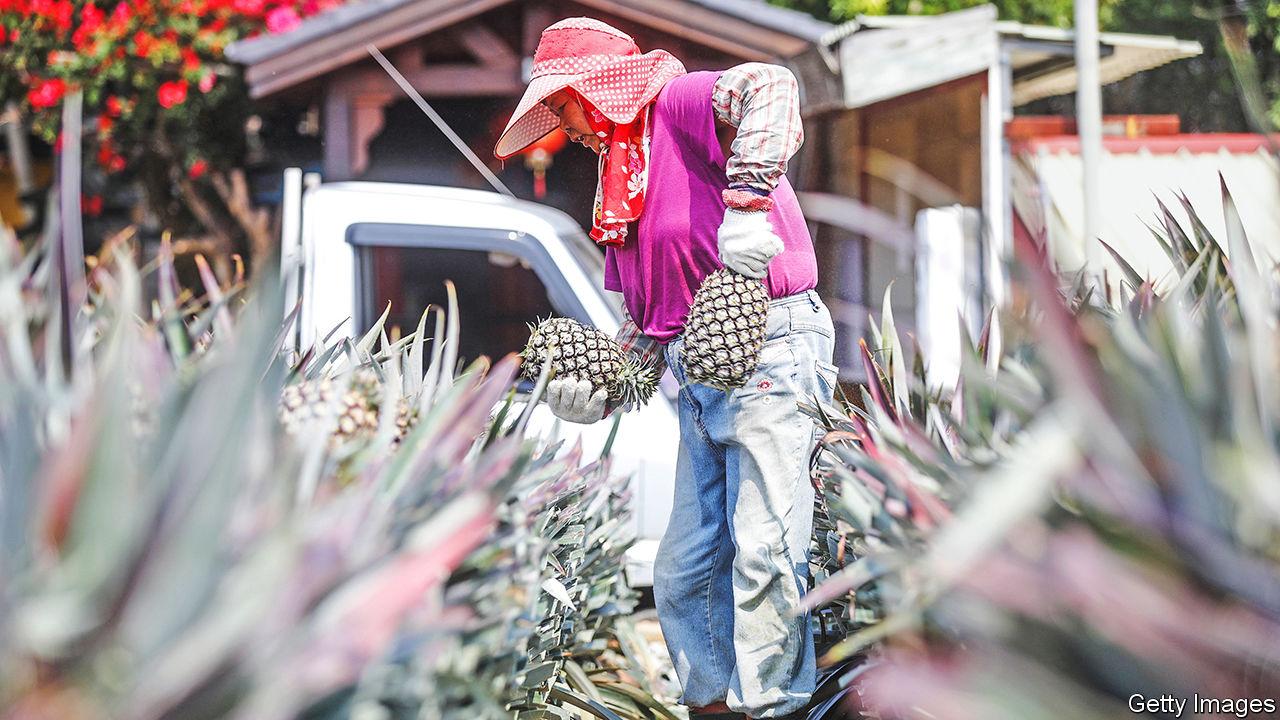 China lifted tariffs on Taiwanese pineapples in 2005, when it hoped to forge closer ties through trade. By 2020 it was buying $49m worth, more than 90% of Taiwan’s annual exports of the fruit. Then, in 2021, China banned all Taiwanese pineapple imports, saying they carried pests. Taiwan called that a political ploy. Soon the pineapple became a symbol of resistance against China.