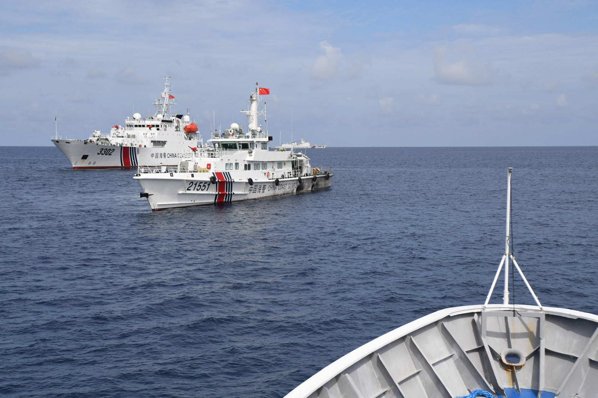 The Philippine vessels were on a resupply mission to the rusting World War II warship near the atoll, where Chinese coastguard ships used water cannon on a Philippine vessel during a stand-off a month ago.