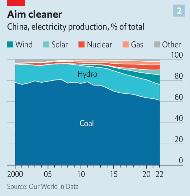 But it is not just China’s embrace of renewable energy that is helping it curb emissions. Its production of carbon-intensive steel and cement has been dropping. After decades of building roads and railways, the government is splurging less on big infrastructure projects. A long expansion of the property sector has ended in a meltdown that has shaken the economy—but led to fewer emissions. Going forward, few analysts expect China’s GDP to grow as fast as it did at the end of last century and the beginning of this one. Put another way, China’s dirtiest phase of development is probably behind it.