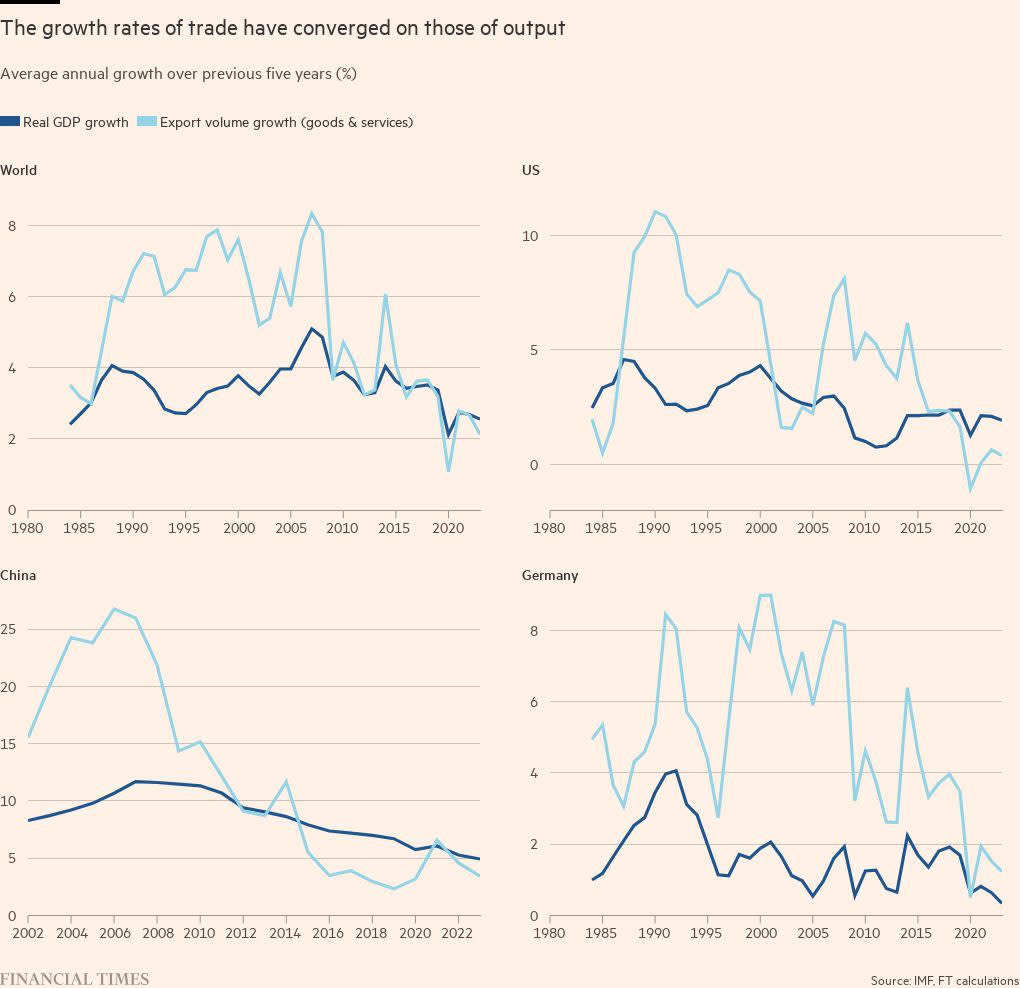 Thereafter, the world economy entered an era some label “slowbalisation”. Subramaniam and Kessler (with Emanuele Properzi) have analysed this in a Peterson Institute piece of November 2023. In this period, trade has grown roughly in line with world output, while ratios of cross-border investment to world output have more than halved.