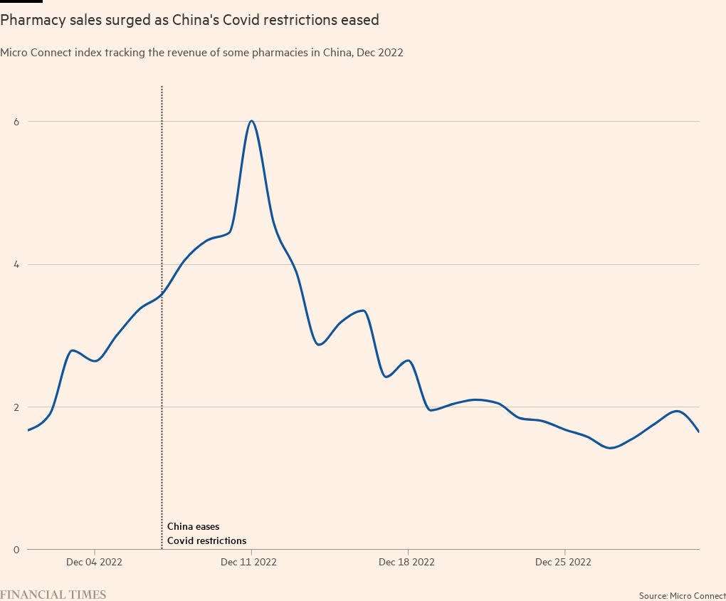 That provides a window into their takings. “We started to observe a very visible [rise]” in pharmacies’ sales, Li tells the Financial Times. “That’s right after the big opening, and the sudden opening,” he adds, referring to President Xi Jinping’s decision to ease pandemic rules earlier that December. “The disease was spreading much, much faster.”