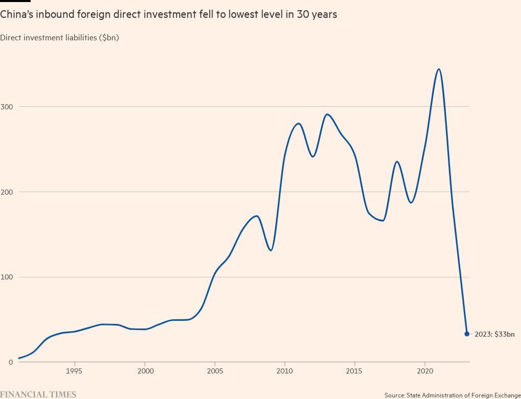 China reported its smallest annual foreign direct investment since the 1990s last year, as the world’s second-largest economy struggled to recover from the pandemic and investors sought higher yields elsewhere.