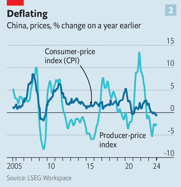 Mr Li spoke of “lingering risks and hidden dangers” to the economy. That is putting it mildly. Consumer and producer prices fell in January by 0.8% and 2.5% respectively, compared with a year earlier (see chart 2). A property crisis is now deep into its third year, with no end in sight. Some of China’s biggest trading partners have turned wary, limiting the country’s access to lucrative markets and high-end semiconductors. China’s stockmarket has lost about $4trn in value since its peak in 2021, despite the government’s recent efforts to arrest its slide. And consumer confidence remains near the lows to which it plunged during the pandemic-related lockdowns of 2022.