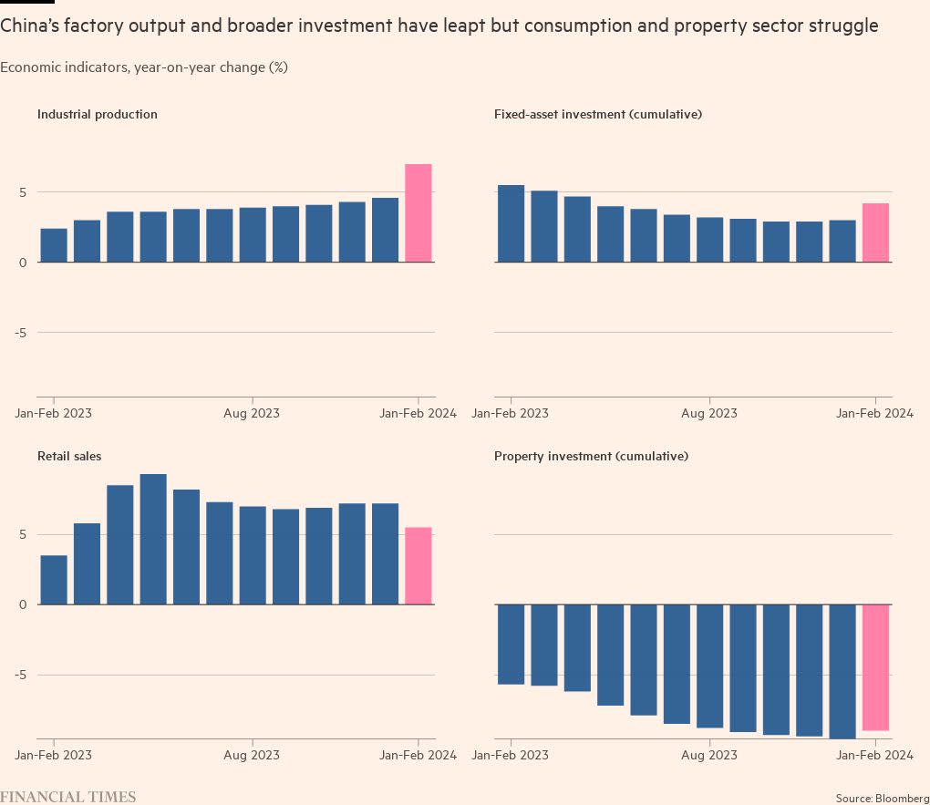 Fixed-asset investment rose 4.2 per cent, which analysts at Oxford Economics suggested was “likely supported by a state-driven push early this year”.