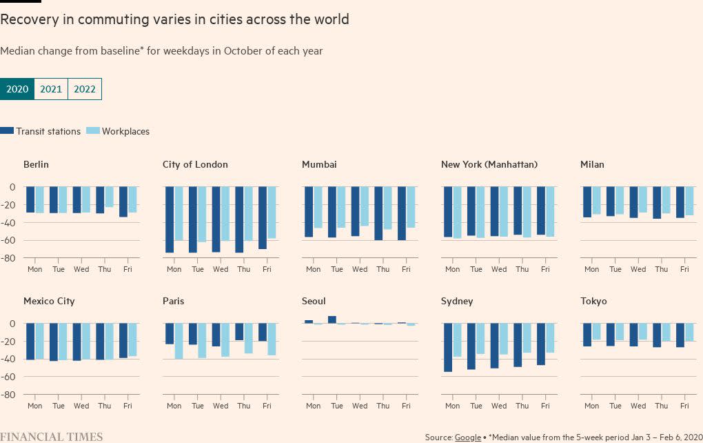 Pandemic predictions of the death of the commute were greatly exaggerated, according to FT analysis of transit data, but new hybrid work options still pose challenges to policymakers and transport authorities.