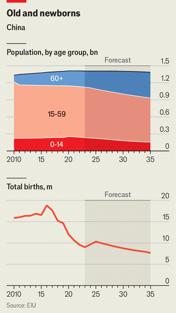 IF CHINA’S OLD people formed their own country, it would be the fourth most populous in the world, right behind America. This silver-haired state would be growing fast, too. China’s over-60 population sits at 297m, or 21% of the total. By 2050 those figures are expected to reach 520m and 38%. Yet demographers describe China’s future as greyer—and smaller. For while its oldest cohorts are growing, younger ones are not (see chart). China’s total population declined for the second year in a row in 2023. The country’s labour force has been shrinking for most of the past decade.