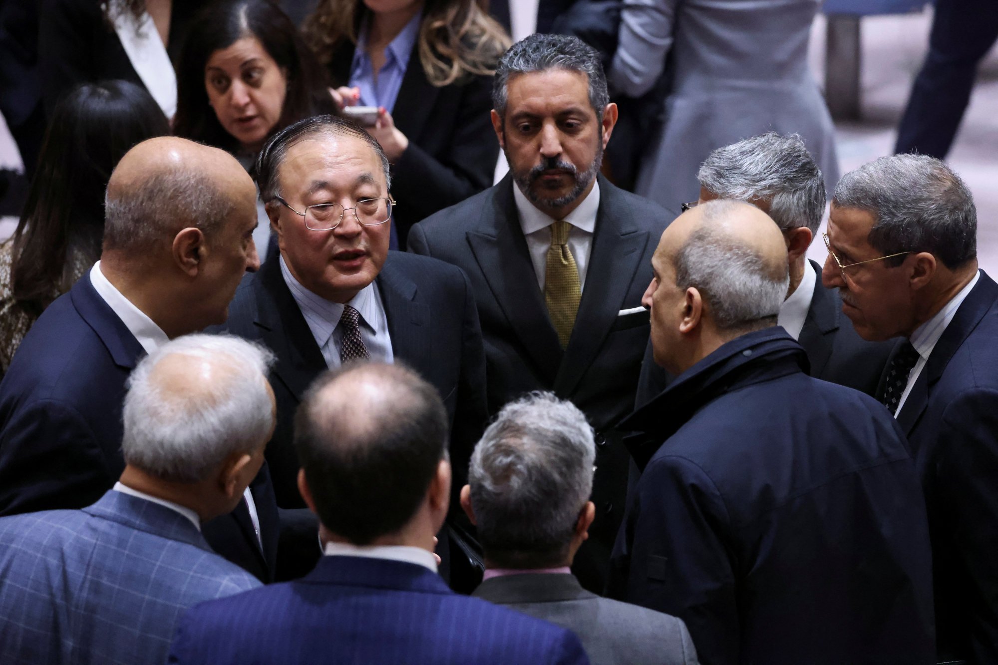 China’s Representative to the United Nations Zhang Jun meets colleagues at the UN Security Council amid a vote on a Gaza resolution that demanded an immediate ceasefire for the month of Ramadan, on March 25. Photo: Reuters