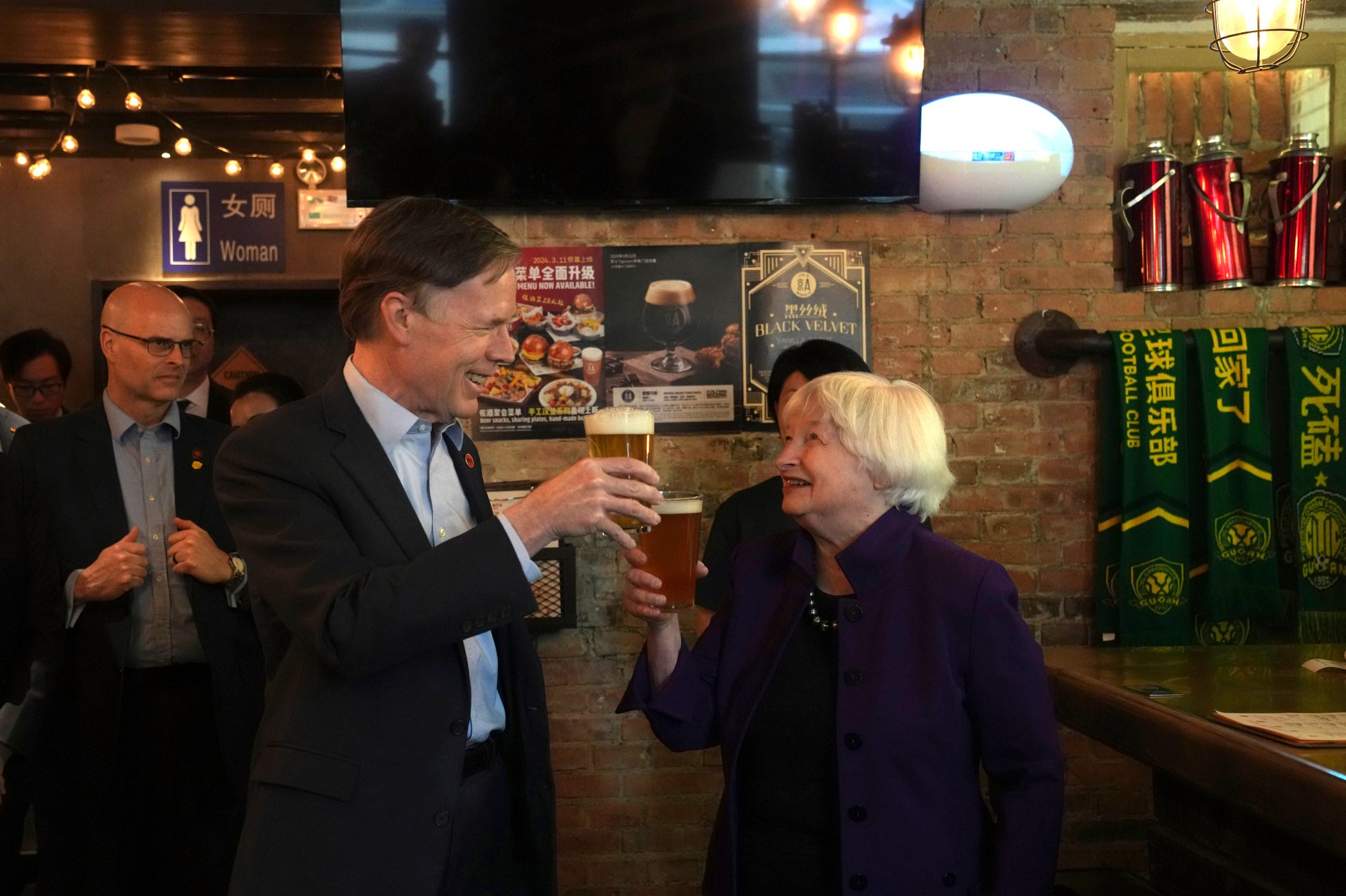 US ambassador to China Nicholas Burns and US Treasury secretary Janet Yellen sample beer at a craft brewery in Beijing on April 8. Photo: AP