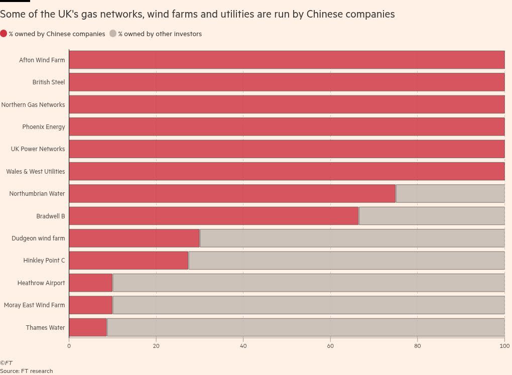 Leading state investors include China Investment Corporation — which owns 8.7 per cent of Thames Water and 10 per cent of Heathrow airport — and China General Nuclear (CGN), which holds a minority stake in the Hinkley Point C plant in Somerset.