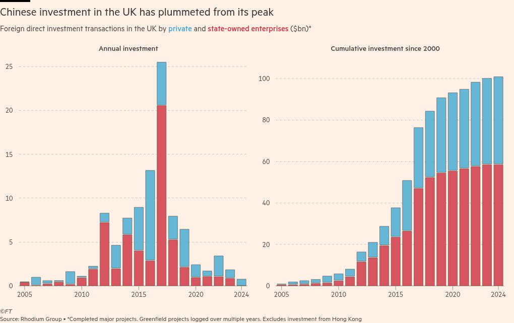 But unpicking decades of spending by Beijing and Chinese businesses across the British economy would be difficult: more than $100bn of Chinese investment has flowed into the country since 2000, according to figures from the Rhodium Group, a research outfit.