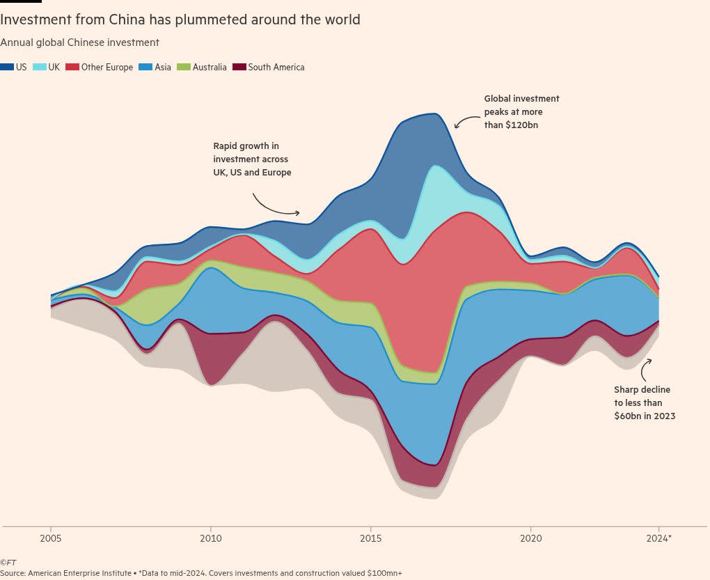 The UK is not alone in seeing a sharp decline in Chinese funding, with AEI data showing investment in major projects declined 97 per cent in the US and 87 per cent in Europe between the mid-2010s peak and 2023.
