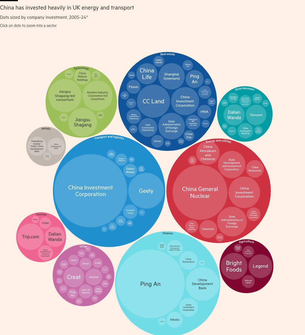 Around a third of Chinese spending on major UK projects has been in the energy, technology and transport sectors, according to the American Enterprise Institute think-tank — fuelling questions about exposure in strategically important areas.