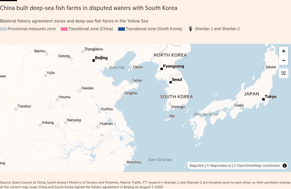 Beijing has tried to downplay the tensions. The Chinese embassy in Seoul last week defended the steel structures as “reasonable use [of] offshore waters” in line with domestic and international law and did not violate a bilateral fishing agreement between the countries.
