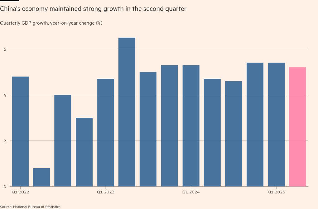 Stay informed with free updates Simply sign up to the Chinese economy myFT Digest — delivered directly to your inbox. The Chinese economy expanded 5.2 per cent year on year in the second quarter as the world’s biggest exporter shrugged off the impact of Donald Trump’s trade war. The rate, which slightly exceeded the 5.1 per cent average estimate from analysts polled by Reuters, positions Beijing to hit its full-year target of about 5 per cent. It shows how China has been able to keep growth on track through exports…