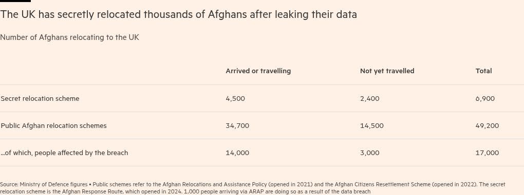 Unlock the Editor’s Digest for free Roula Khalaf, Editor of the FT, selects her favourite stories in this weekly newsletter. A historic UK government data security breach put tens of thousands of Afghans at heightened risk of murder and torture by the Taliban. The episode set in train an extraordinary set of events, including the creation of a secret immigration scheme at one point projected to cost as much as £7bn, and the imposition of an unprecedented super-injunction. What was the original breach? An unnamed British soldier in February 2022…