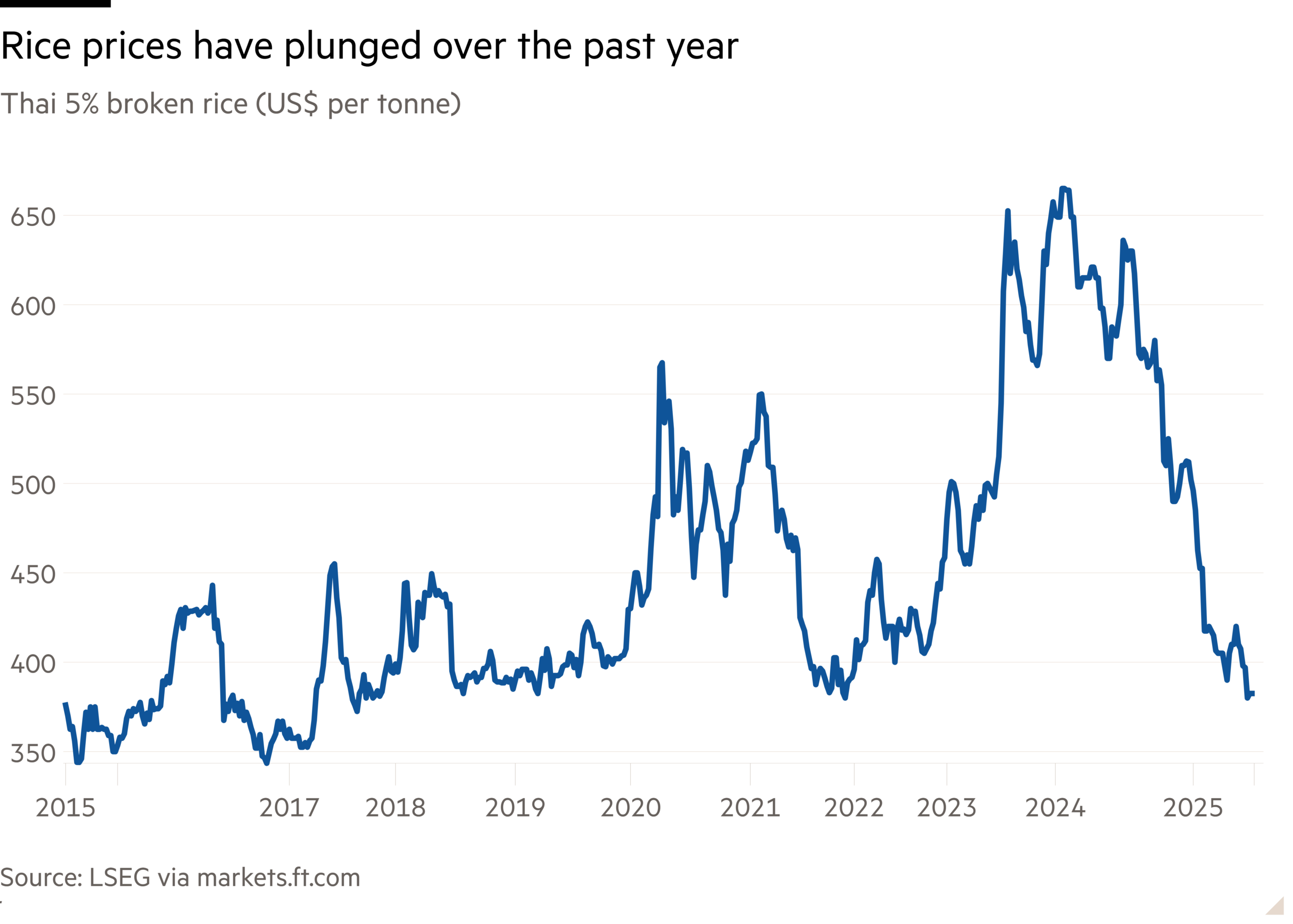 Unlock the Editor’s Digest for free Roula Khalaf, Editor of the FT, selects her favourite stories in this weekly newsletter. Global rice prices have tumbled to their lowest level in eight years, in a blow to many farmers across Asia, as record harvests and the ending of export bans in India flood the market with supply. Export prices for Thai 5 per cent broken white rice, the global benchmark, have dropped to $372.50 per tonne in recent days, a 26 per cent decline since late last year and their lowest level…