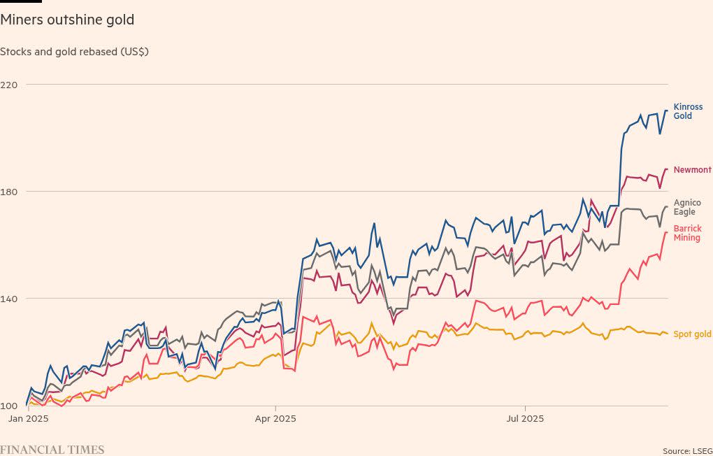 Unlock the Editor’s Digest for free Roula Khalaf, Editor of the FT, selects her favourite stories in this weekly newsletter. Picks and shovels never looked so good. Gold miners are trouncing the shiny metal: while gold has barely budged over the past three months, share prices of those that hack it out of the ground are up by as much as a third. The relative fortunes make textbook sense. A chunk of fixed costs means miners’ profits should increase beyond the price of gold, thanks to the financial magic of…
