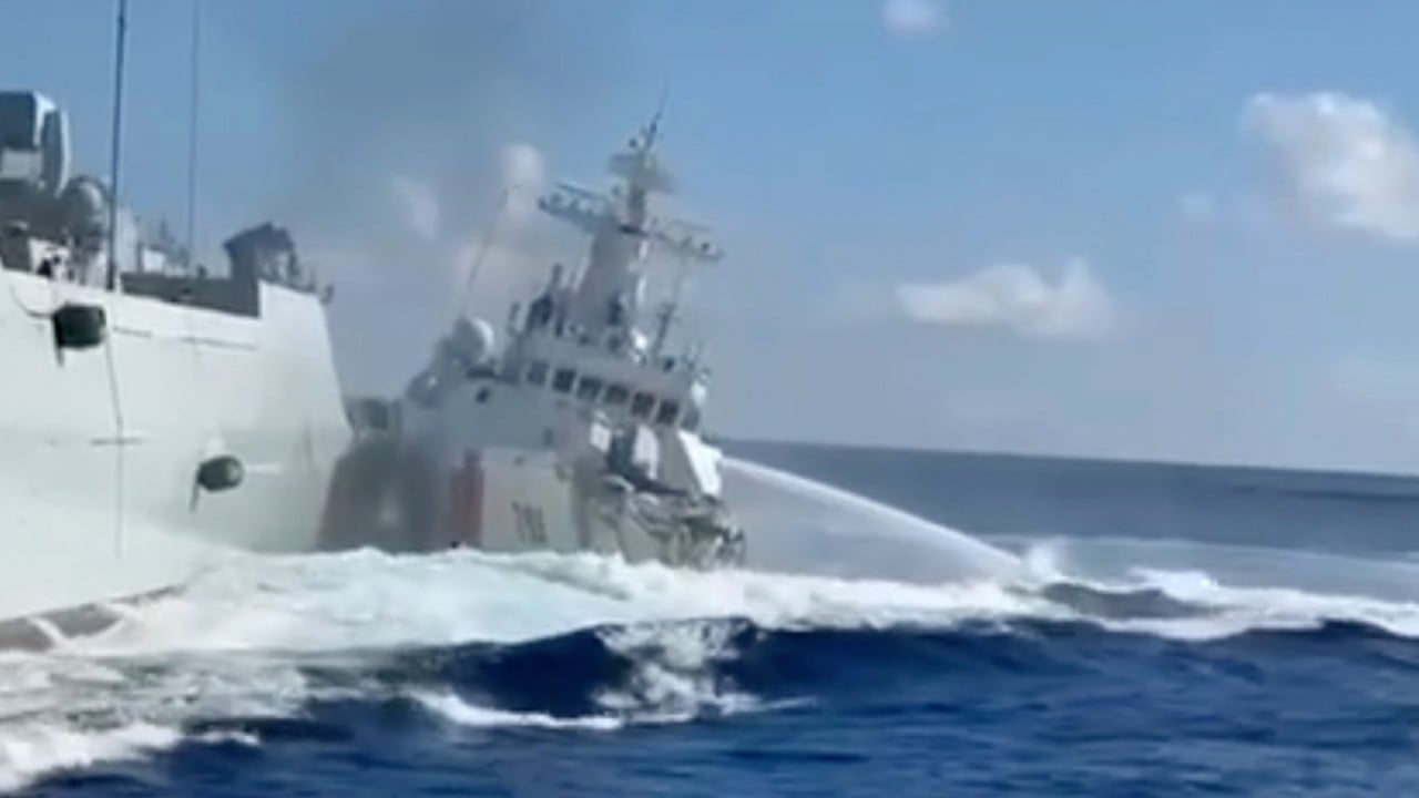 In a 33-second video released by the China Coast Guard, a Philippine crew member is seen filming the Chinese ship. One of the Philippine ships also crosses in front of the Chinese vessel.