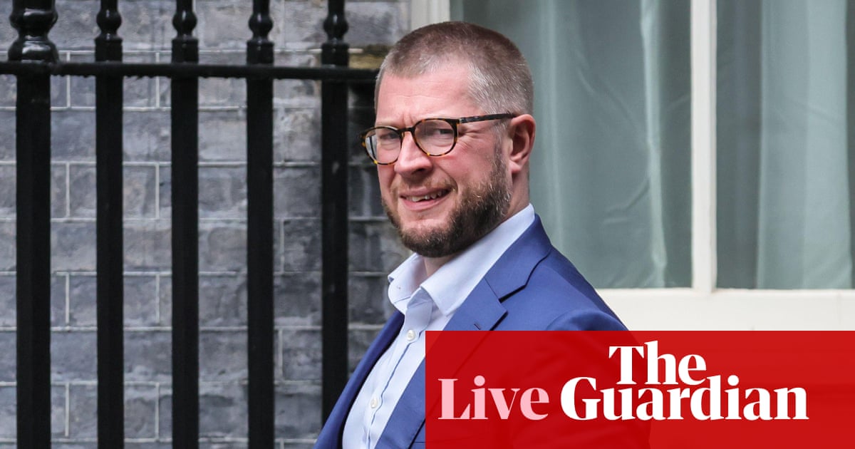 ","elementId":"aaa6c848-9575-4ee6-b157-5d17aa34a0ae"}],"attributes":{"pinned":false,"keyEvent":true,"summary":false},"blockCreatedOn":1757949684000,"blockCreatedOnDisplay":"11.21 EDT","blockLastUpdated":1757952292000,"blockLastUpdatedDisplay":"12.04 EDT","blockFirstPublished":1757951234000,"blockFirstPublishedDisplay":"11.47 EDT","blockFirstPublishedDisplayNoTimezone":"11.47","title":"Why Paul Ovenden’s resignation matters","contributors":[],"primaryDateLine":"Mon 15 Sep 2025 12.45 EDT","secondaryDateLine":"First published on Mon 15 Sep 2025 04.37 EDT"},{"id":"68c833648f086fc1f70af955","elements":[{"_type":"model.dotcomrendering.pageElements.TextBlockElement","html":"