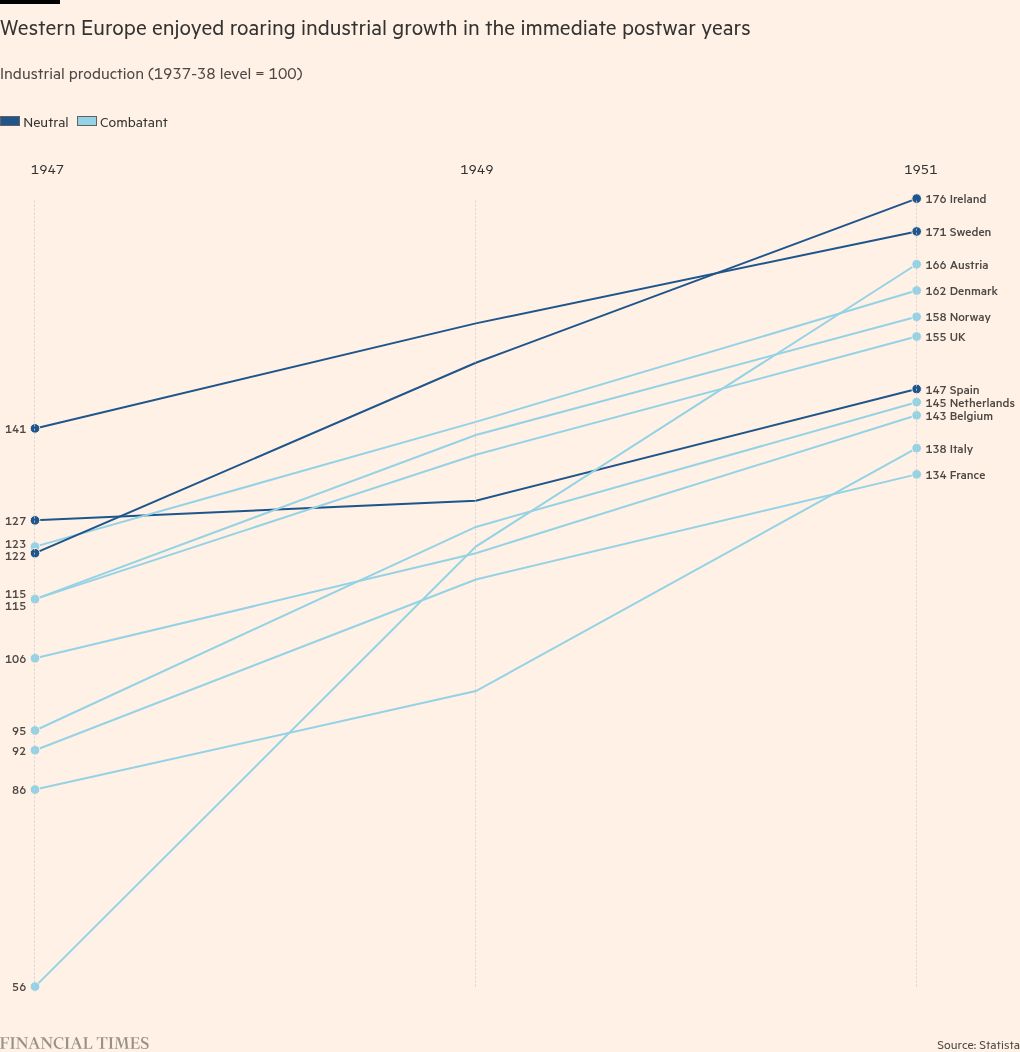It was US policy to relieve European “dollar shortage”, the term for the old world’s impaired capacity to pay for imports through sufficient exports (or foreign investment earnings; vast European-owned assets overseas had been liquidated during the war). In other words, the US set out to boost Europe’s purchasing power through grants and loans — a “dollar surplus recycling mechanism” in the jargon. Look through the financial intermediation, and it boils down to the US sending some of its surplus production across the Atlantic for free or on credit.