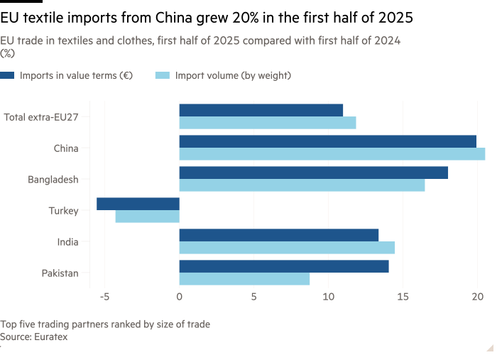 Unlock the Editor’s Digest for free Roula Khalaf, Editor of the FT, selects her favourite stories in this weekly newsletter. China’s textile exports into the EU have surged as manufacturers hit by heavy US tariffs redirect goods to Europe, the European textile industry body has said. EU imports of Chinese clothing and textiles increased by 20 per cent in value and volume in the first half of 2025, compared with last year, according to Euratex data shared with the Financial Times. The majority of the value increase came from an…