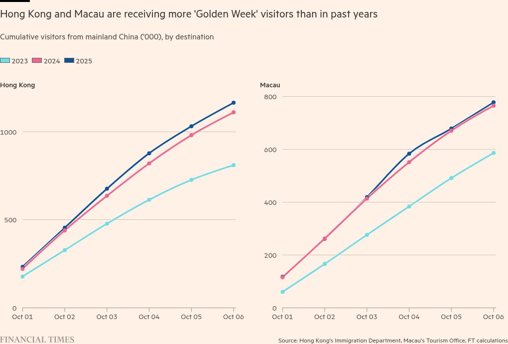 Through China’s eight-day public holiday this week, there has been no shortage of public data trumpeting a travel frenzy, including more than 100mn train journeys by last weekend and 1bn trips from one region to another, according to state media and ministry announcements.