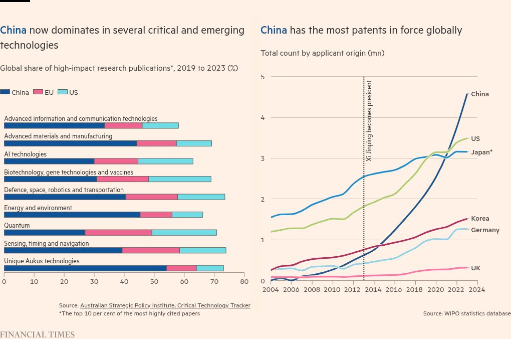 China led in just three of 64 critical technologies between 2003 and 2007, but had become the top country in 57 of those technologies between 2019 and 2023, according to the Australian Strategic Policy Institute.