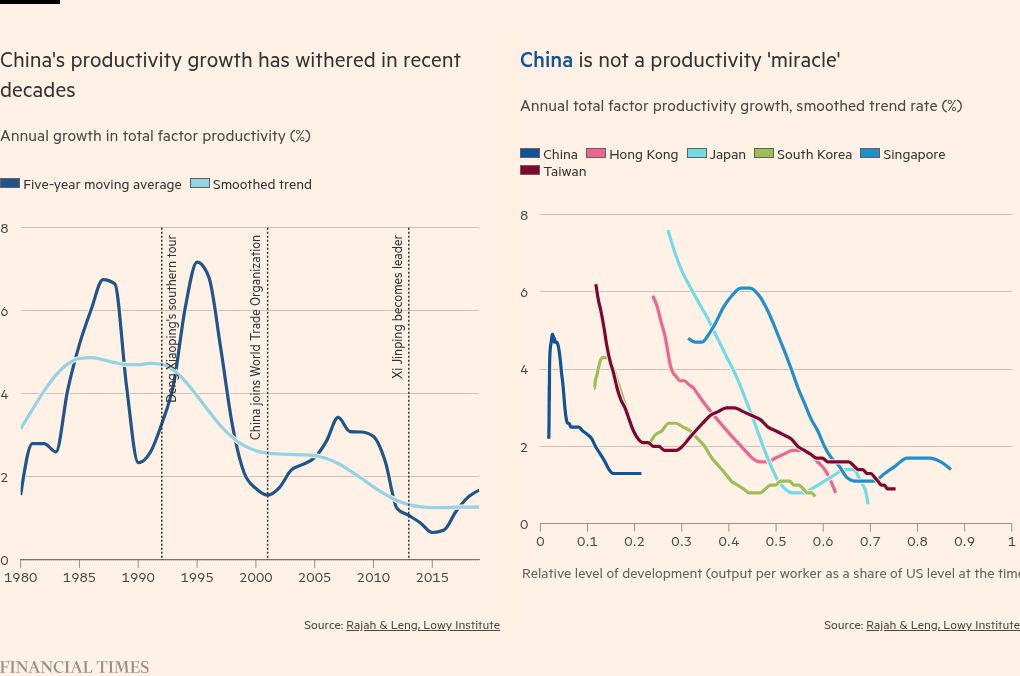 At comparable levels of development, China’s TFP growth has also underperformed east Asian “miracle” economies by a wide margin, according to analysis by the Lowy Institute.