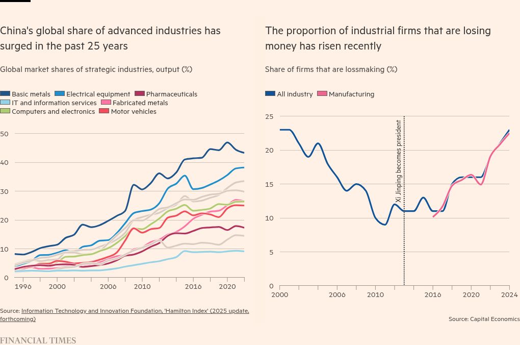 The rush to enter high-tech sectors and win state support has also led to overproduction and fierce price competition, or “involution”. Ports are turned into EV car parks; AI chips lie idle in newly constructed data centres. The surplus is harder to export abroad, as trade partners have cottoned on to the risk of dumping.