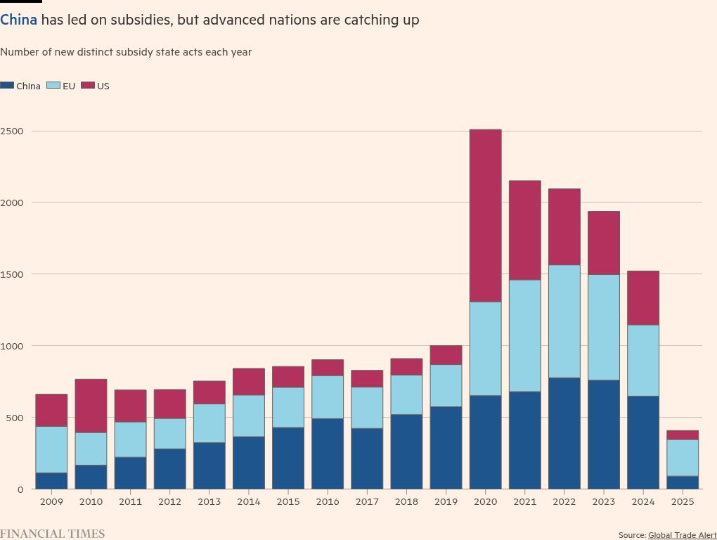 Data from the Global Trade Alert shows that China has implemented more than 7,500 subsidy policies since 2009. Between 2009 and 2022, Beijing’s total subsidy count was equal to about two-thirds of all those adopted by G20 advanced economies combined, according to the IMF.