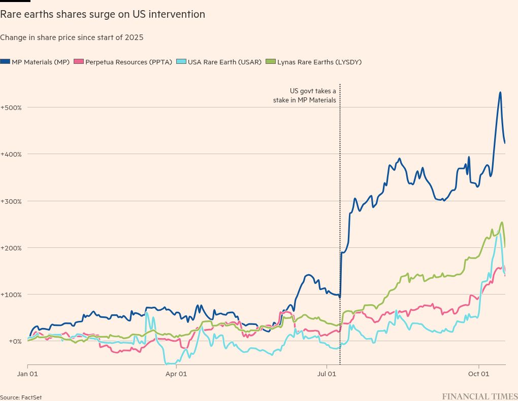Unlock the Editor’s Digest for free Roula Khalaf, Editor of the FT, selects her favourite stories in this weekly newsletter. Investors are racing to back rare earth companies, sending their shares to record highs, as Donald Trump’s attempt to break China’s stranglehold on the supply of critical minerals electrifies the once sleepy sector. The White House is pursuing increasingly radical steps to kick-start the production of rare earths outside China, which has long dominated the supply of minerals used in smartphones, electric vehicles and fighter jets. Shares of US-listed companies…