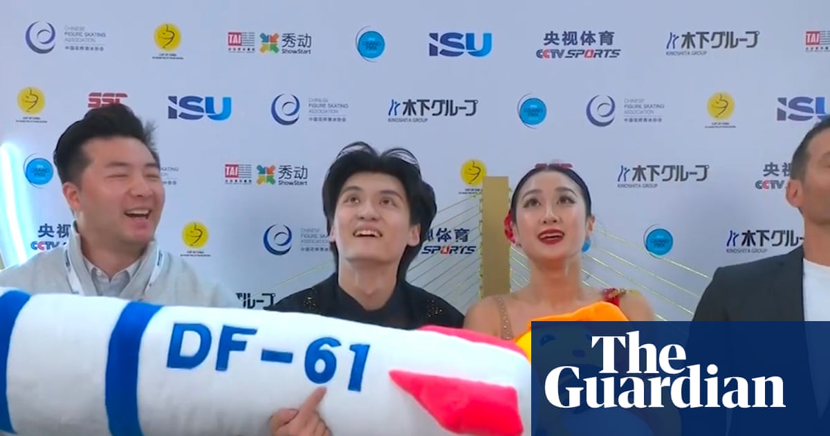 TV footage showed Ren Junfei and Xing Jianing sitting with a large toy in the shape of a missile labelled ‘DF-61’ as they were waiting for their scores in the ‘kiss and cry’ area at the Cup of China on Saturday. The toy was briefly held up by Ren, Xing and a coach, then placed across Xing’s lap.