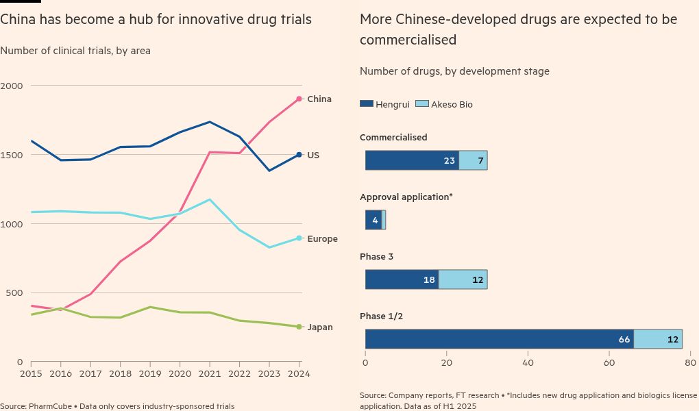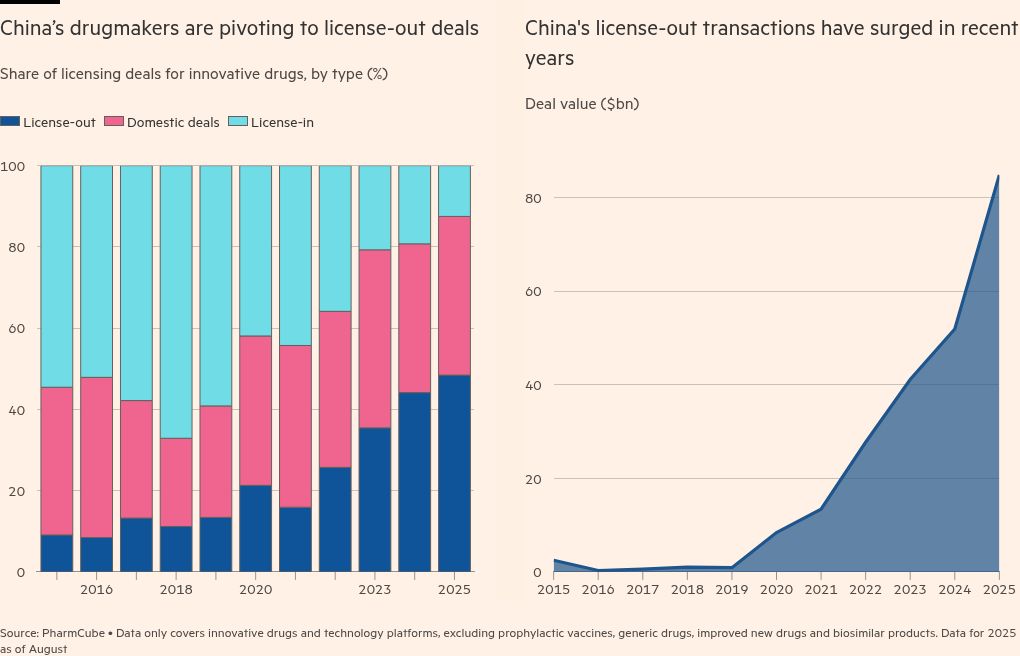There have been 93 overseas licensing deals in the first eight months of 2025, worth a combined $85bn, according to Chinese data provider PharmCube — with domestic companies selling the international rights to homegrown drugs. The total value of deals is on track to hit its sixth consecutive annual record, underscoring the speed at which the country’s pharmaceutical sector is internationalising.