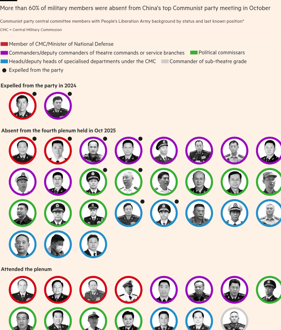 The heads of all but one of the PLA’s five regional commands are currently unaccounted for, are under investigation or have been fired. The navy and the ground force have followed the rocket force in having their commanders targeted. The heads of several specialised departments under the Central Military Commission, the top command organ led by Xi, have disappeared from public view. And scores of political commissars have been ousted or are under some form of party investigation.