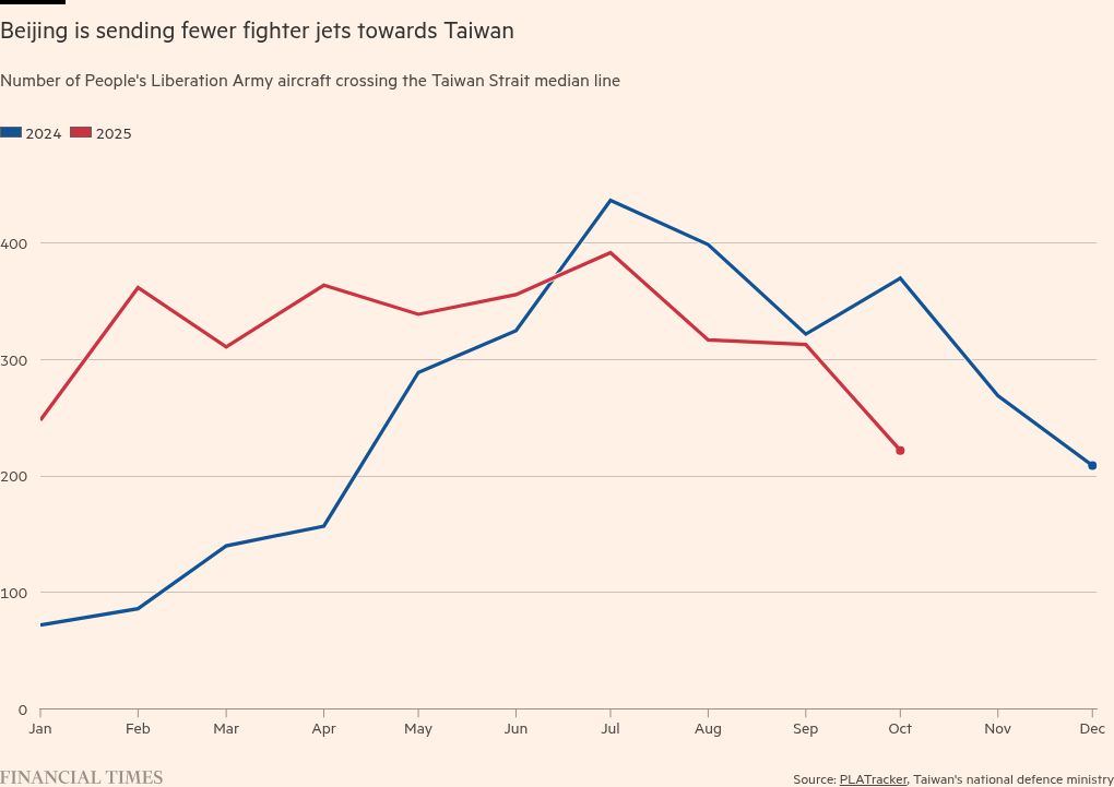 Since May, the Chinese military has been sending many fewer fighter jets directly across the Taiwan Strait’s median line than in the same period last year. Since July, overall monthly numbers of PLA aircraft flying close to Taiwan airspace have also dropped off compared to 2024.
