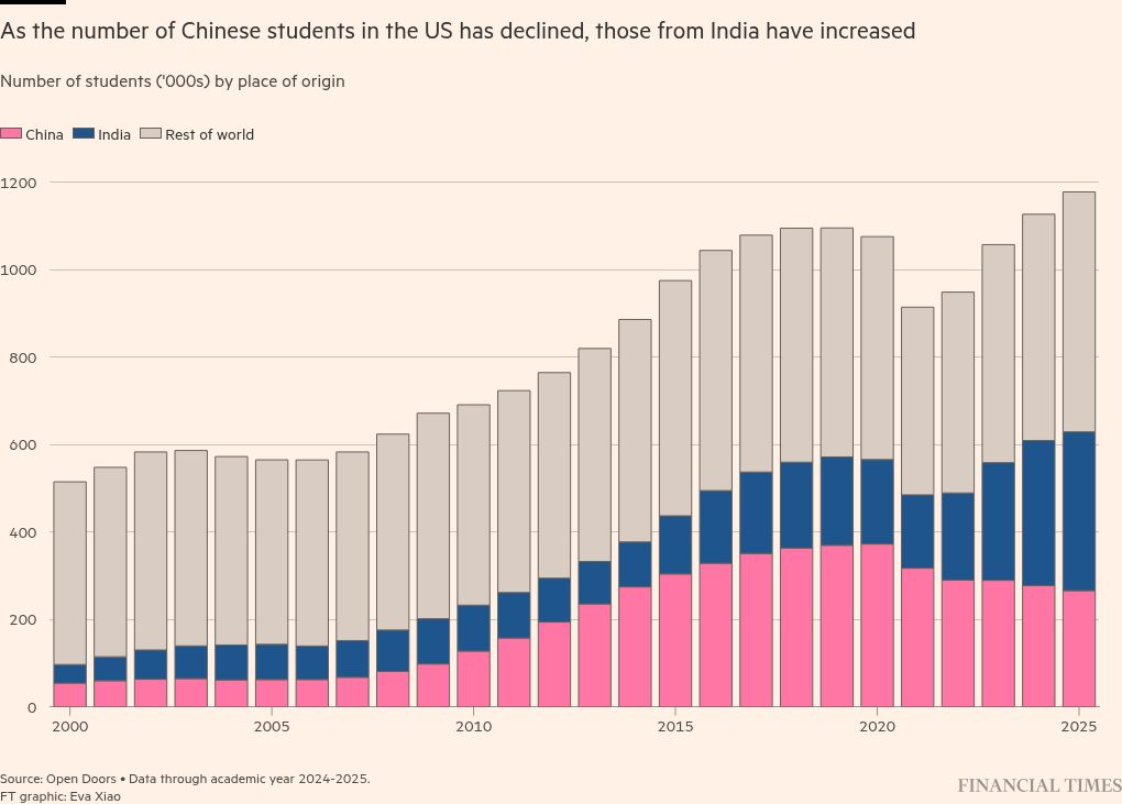 The number of new international students in US universities fell 17 per cent this year, one of the sharpest ever declines in foreign enrolments amid Trump’s tough policies. India remained the largest country of origin for all foreign students in the US at more than 30 per cent, ahead of China at 23 per cent.
