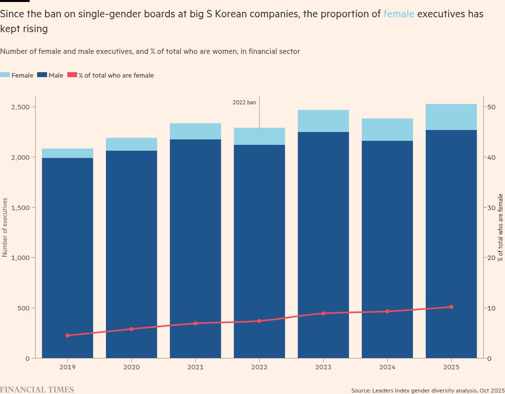 The number of female executives is increasing after legislation in 2022 banned single-gender boards at companies with assets of more than Won2tn. But women still hold only 12.7 per cent of executive positions at South Korean banks, although this is higher than the 8.1 per cent average across the country’s 500 biggest companies, according to Leaders Index.