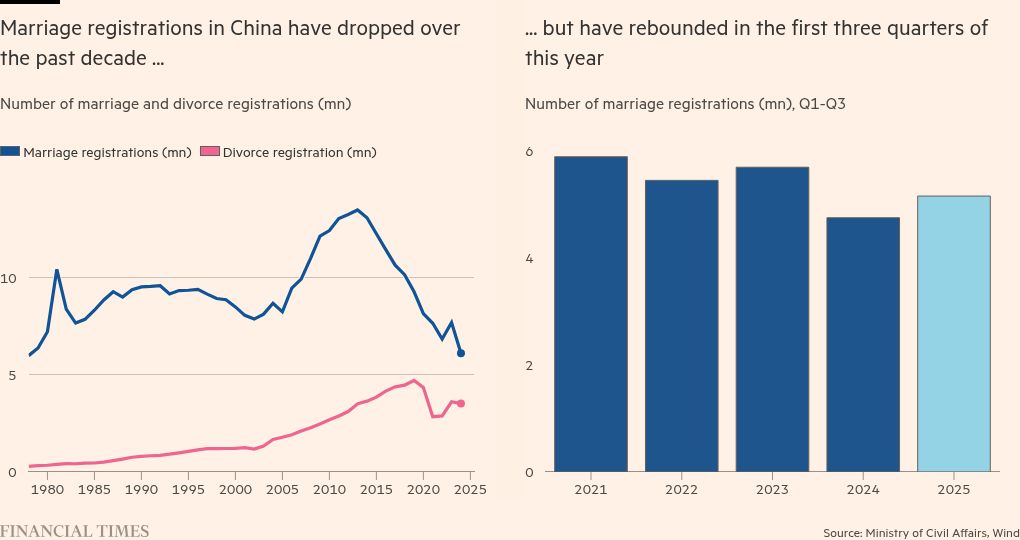 For Chinese officials wanting more couples to marry as a route to boosting the country’s low birth rate, the early evidence is encouraging. In the first three quarters of 2025, 5.2mn new marriages were recorded, according to statistics from the Ministry of Civil Affairs, an increase of 405,000 from a year earlier. The figures were a “modest but notable turnaround”, China Daily said.