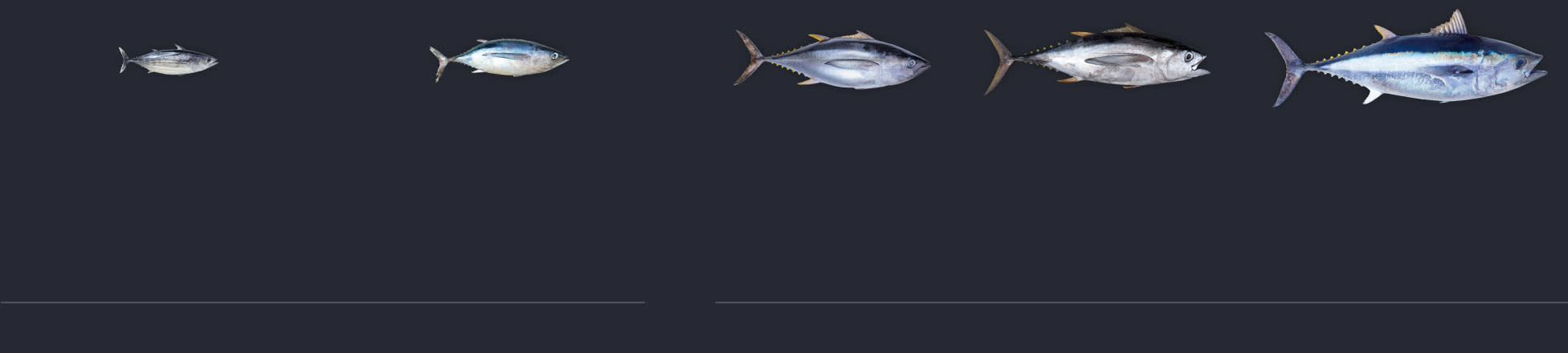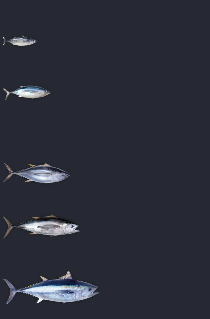 Graphic: Images of five main tuna species — skipjack, yellowfin, bigeye, albacore and bluefin — showing their size differences, key traits and status. Skipjack and albacore are generally not overfished, while yellowfin, bigeye and bluefin have some overfished stocks.