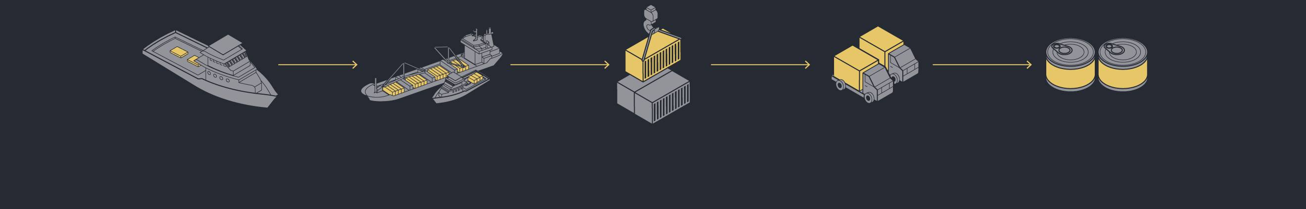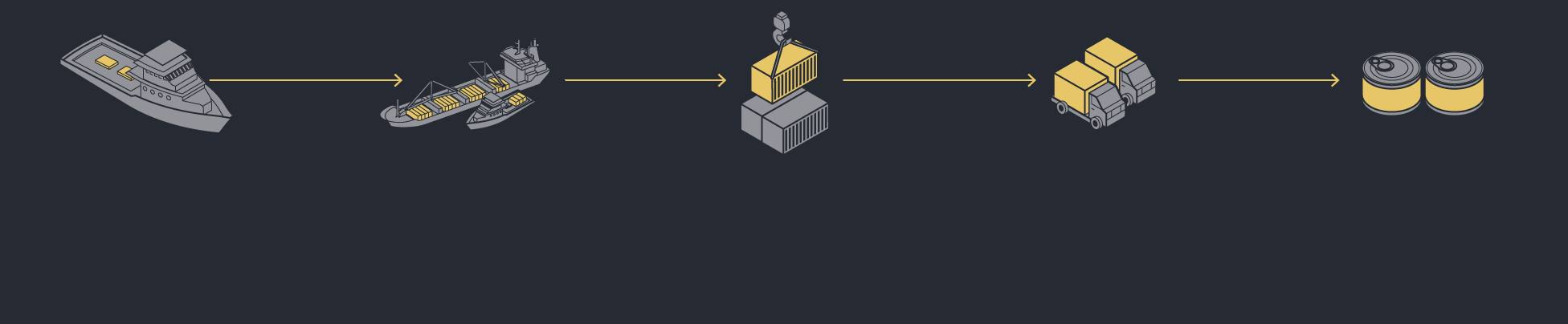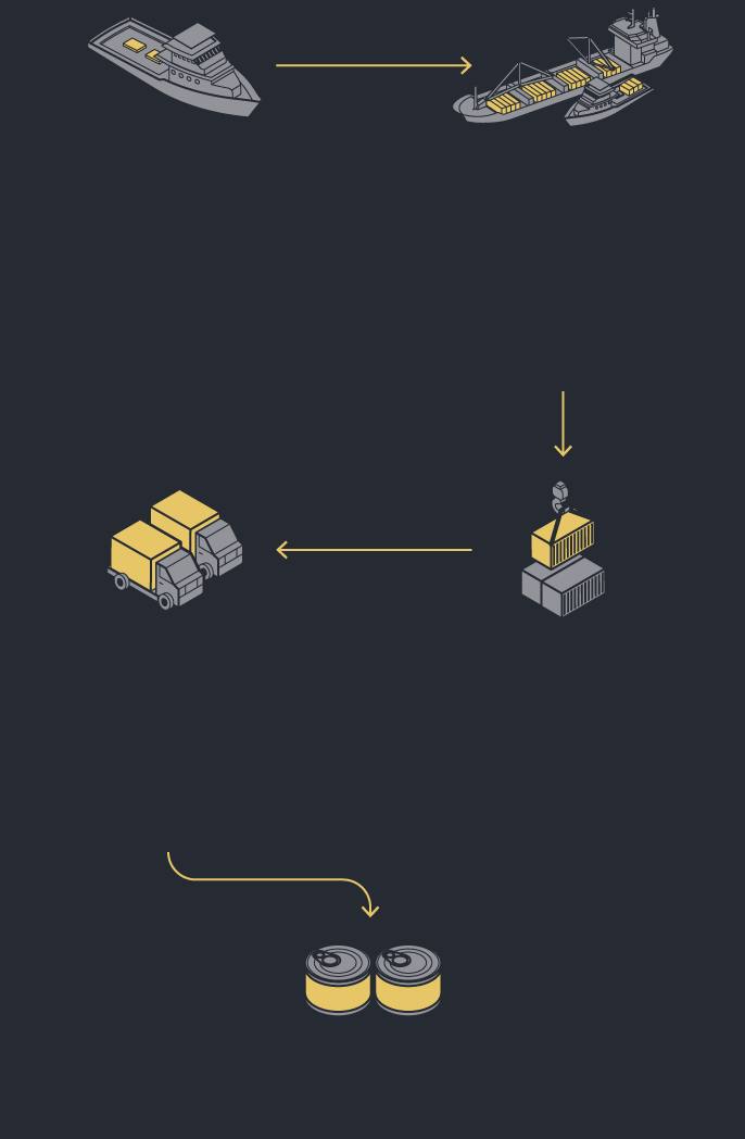 Graphic: Flow diagram of the tuna supply chain showing all the stages from fishing, transshipment and trade hubs to processing and retail. Large fleets catch the majority of tuna.