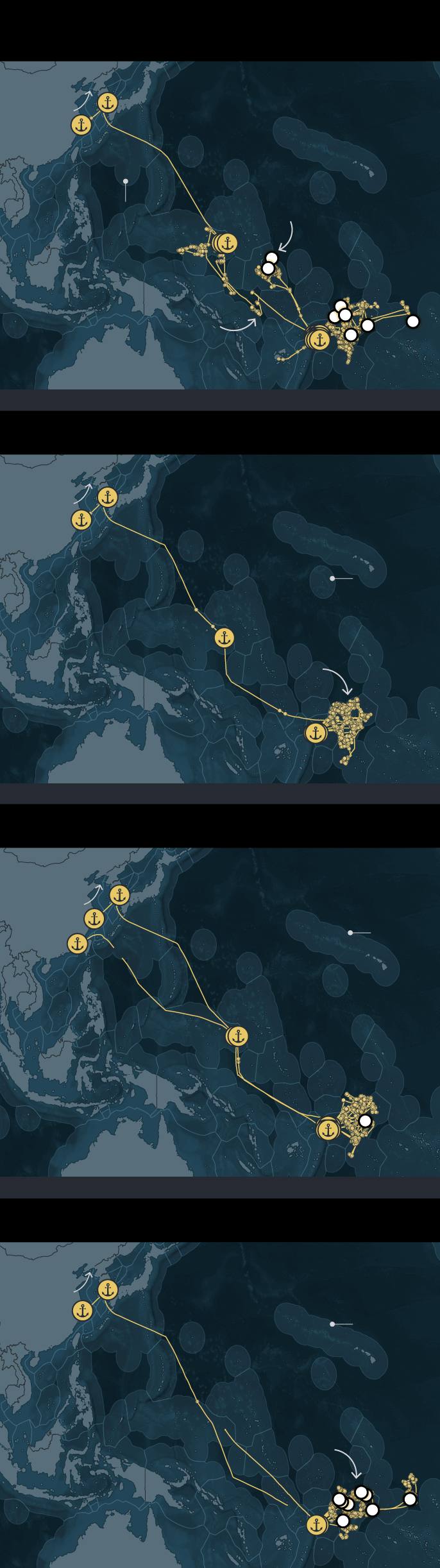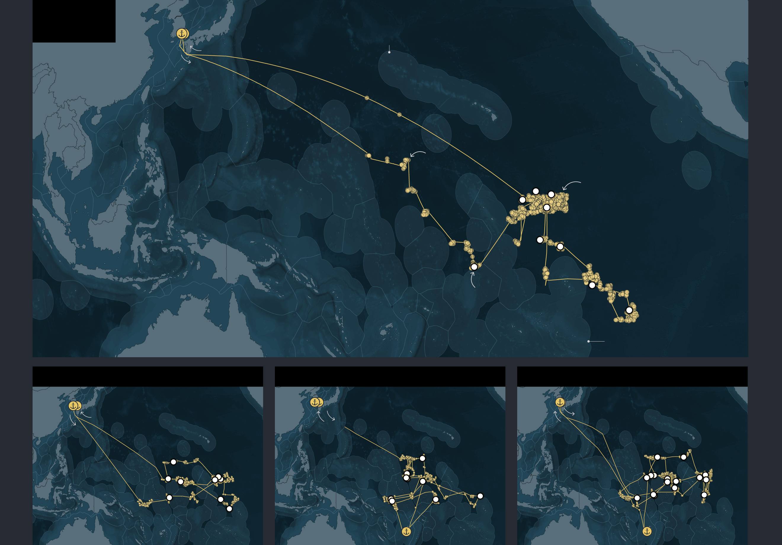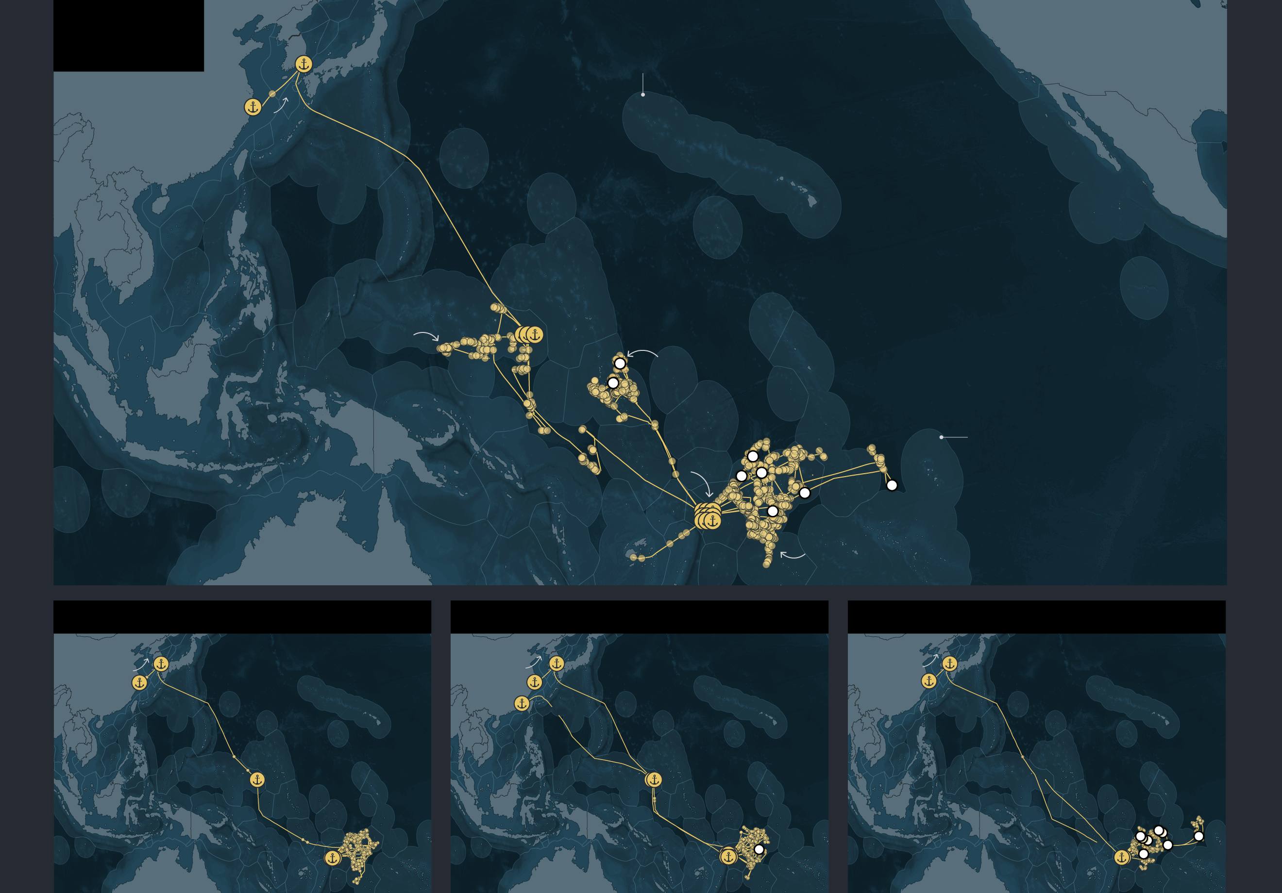Graphic: A series of maps show the fishing routes of four South Korean longline vessels — Dongwon 201, Dongwon 205, Dongwon 203 and Dongwon 208 — in the Western Pacific Ocean. Each map traces voyages from Busan, South Korea, to fishing areas near Micronesia, the Marshall Islands, and Fiji between 2023 and 2025. Points mark fishing events and brief port or transshipment stops, illustrating voyages of up to nearly three years.