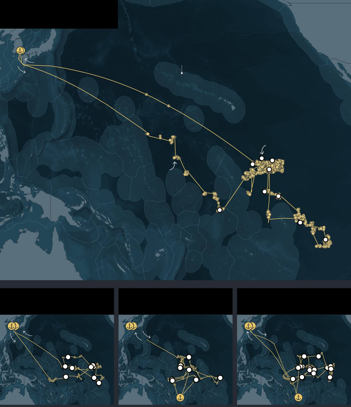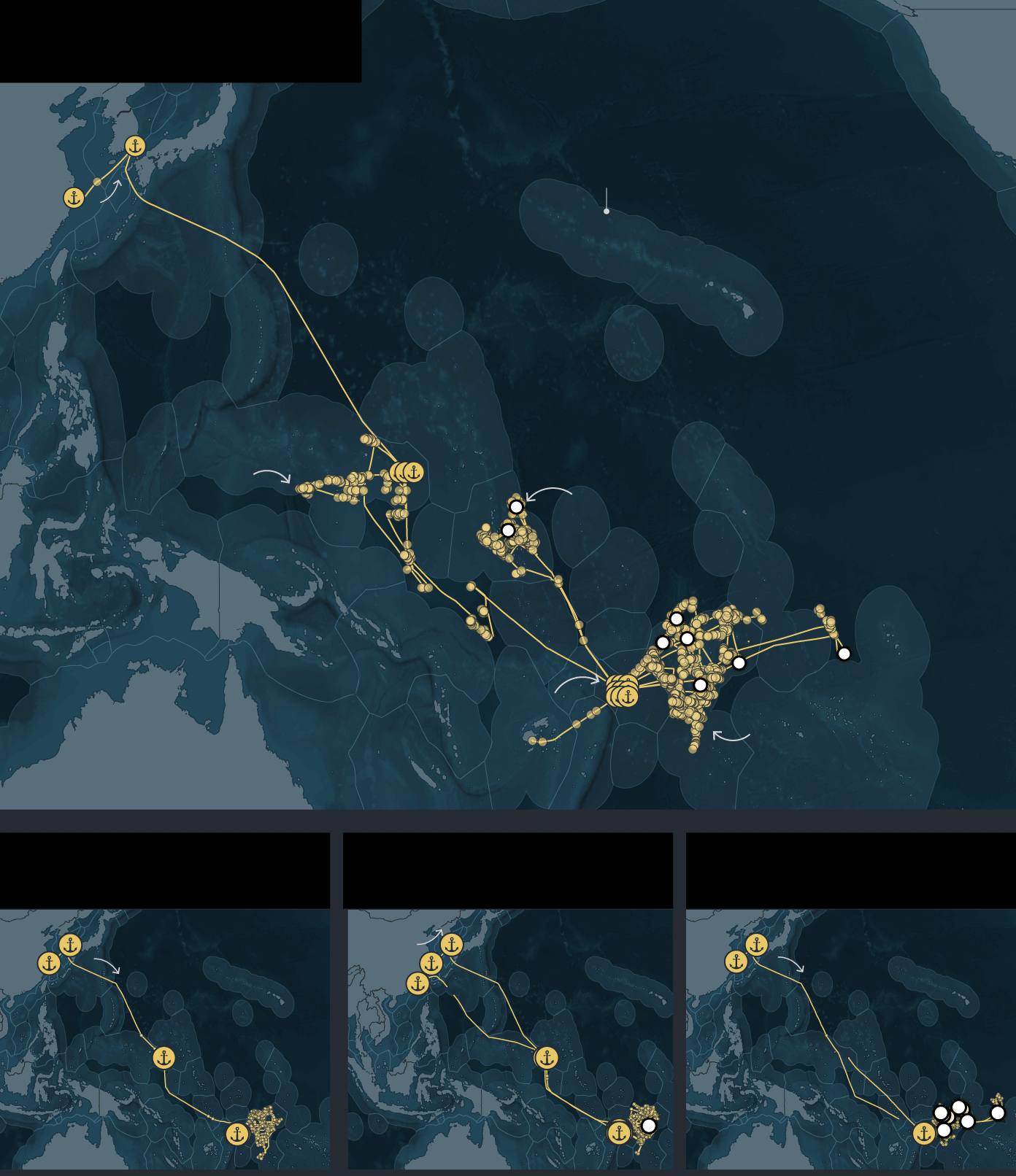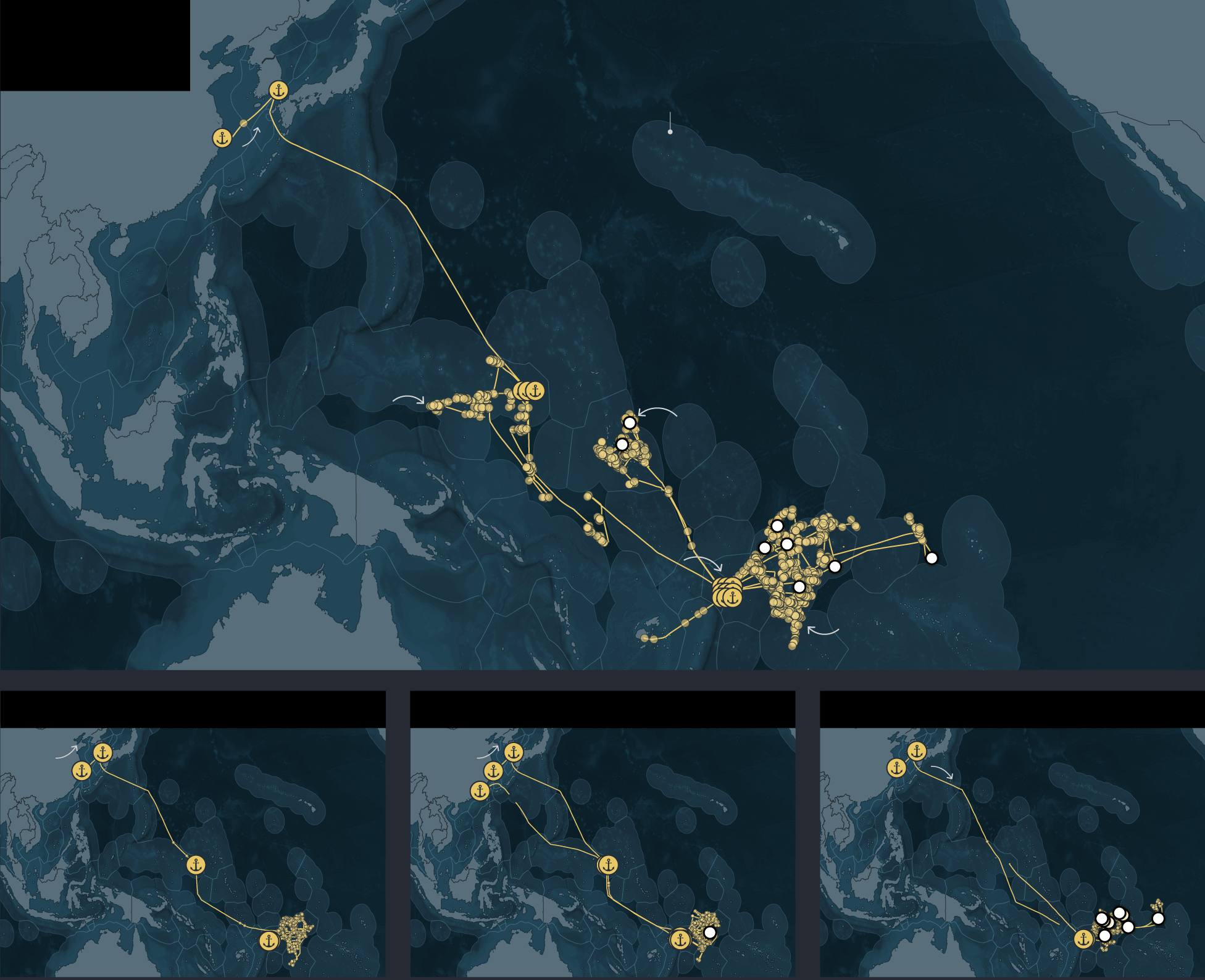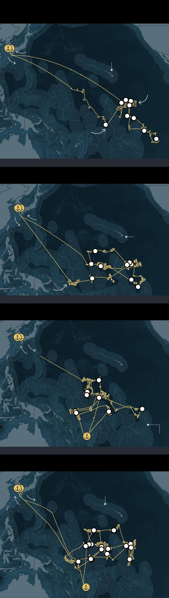 Graphic: A series of maps show the fishing routes of four South Korean longline vessels — Dongwon 201, Dongwon 205, Dongwon 203 and Dongwon 208 — in the Western Pacific Ocean. Each map traces voyages from Busan, South Korea, to fishing areas near Micronesia, the Marshall Islands, and Fiji between 2023 and 2025. Points mark fishing events and brief port or transshipment stops, illustrating voyages of up to nearly three years.