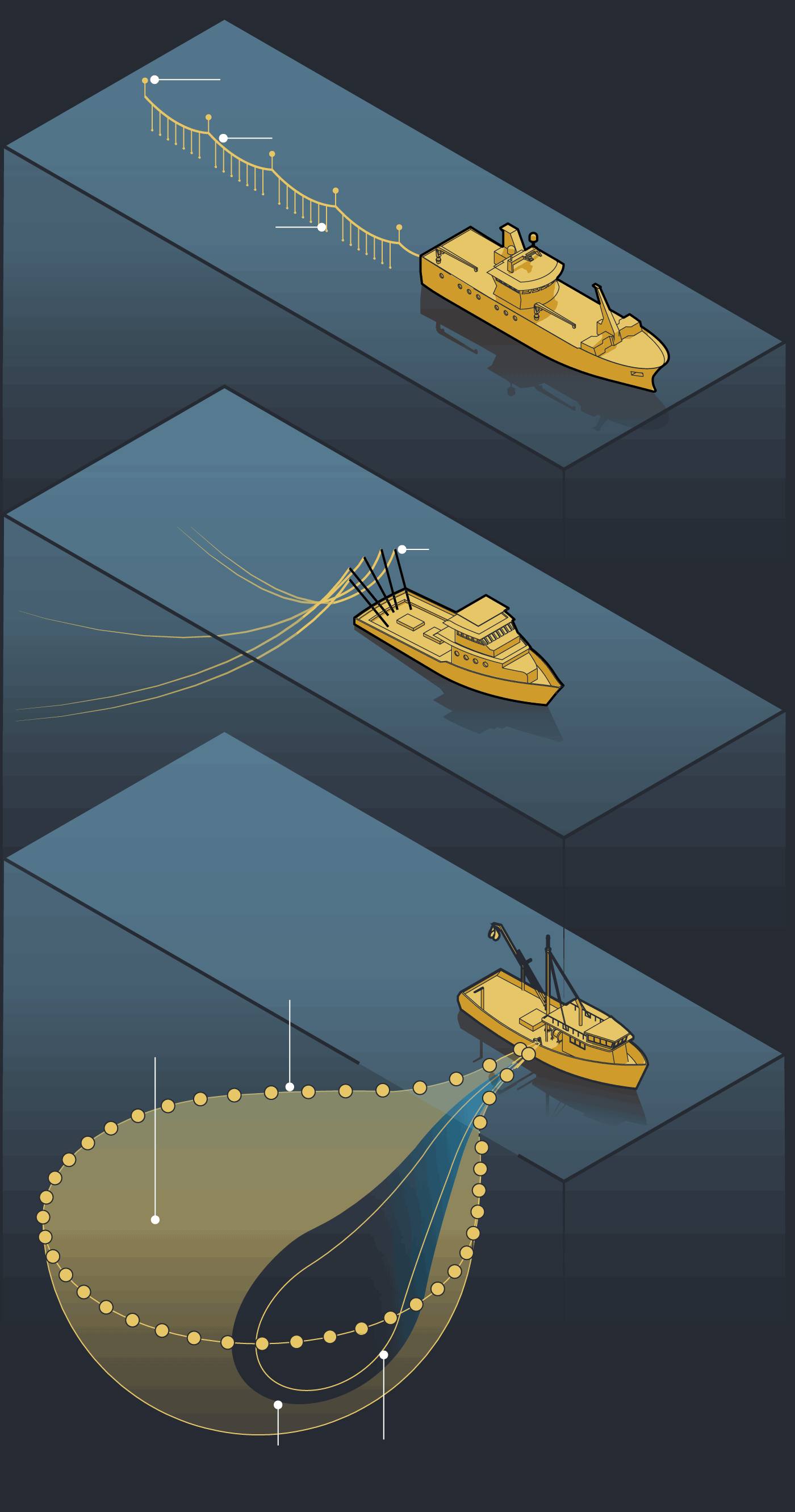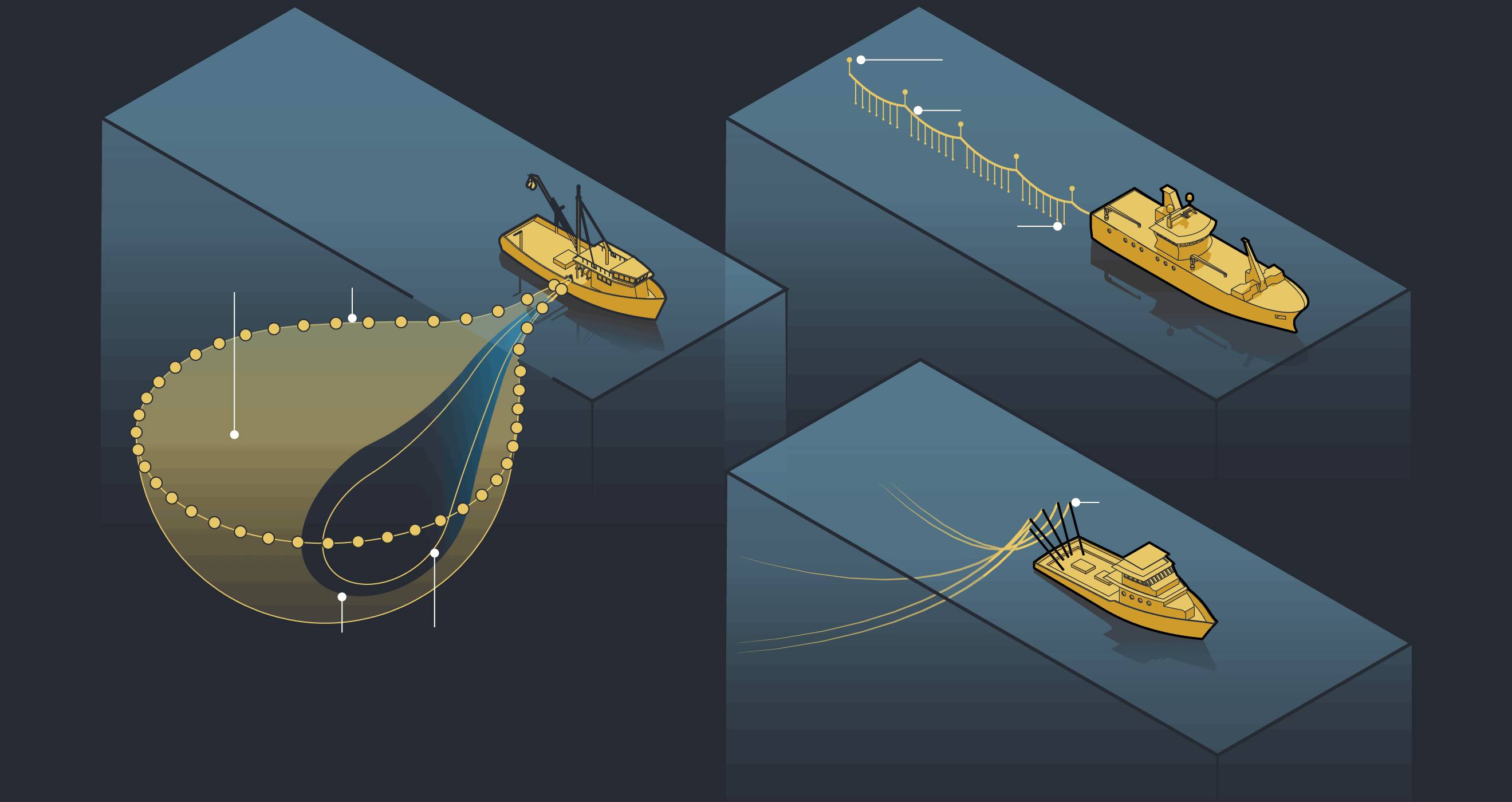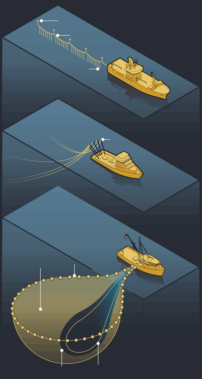Graphic: Infographic comparing tuna fishing methods: purse seining with a large net encircling surface-dwelling fish; longlining with a mainline, floats and hooked branchlines for deeper-swimming tuna; and one-by-one pole-and-line fishing, shown as the most sustainable method