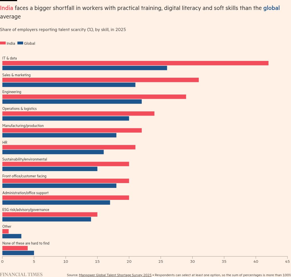 India faces a bigger shortfall in workers with practical training, digital literacy and soft skills than the global average.