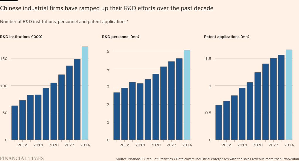 While government R&D spending in China has exceeded that of the US since 2015, Chinese companies have also rapidly increased their R&D efforts over the past decade, national statistics bureau data shows. The number of corporate R&D institutions has also nearly tripled to more than 150,000. And the number of corporate R&D personnel nearly doubled to 5mn.