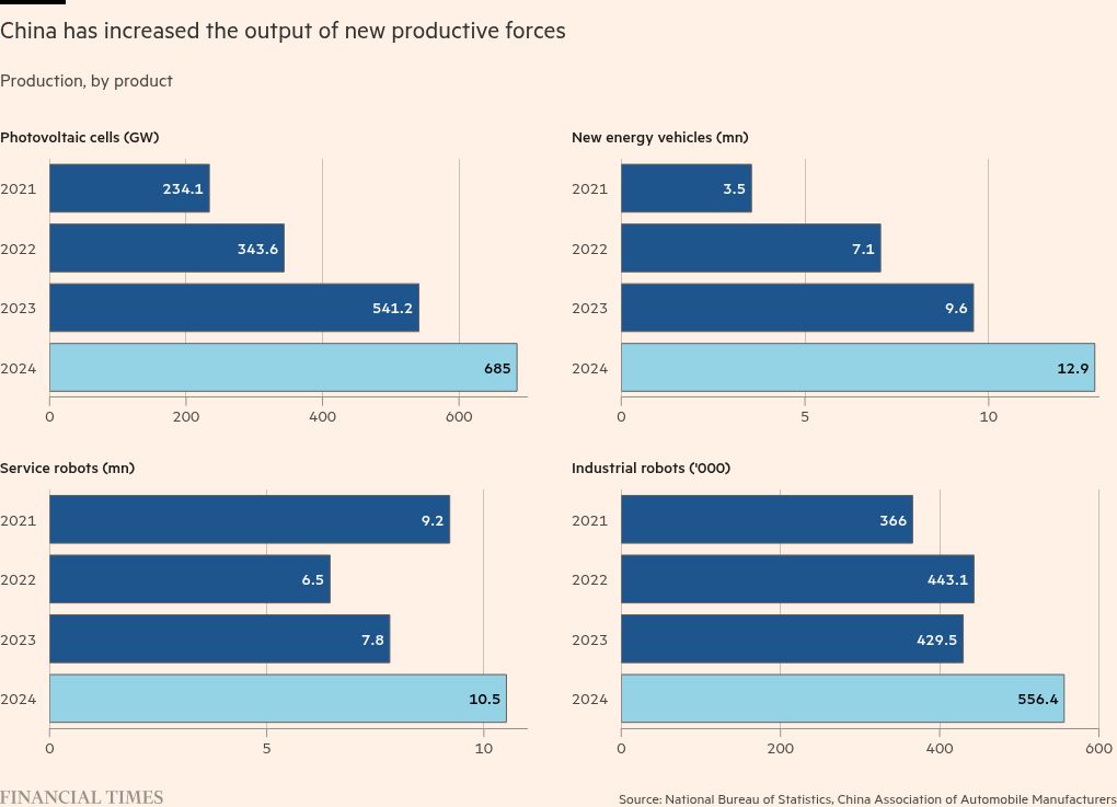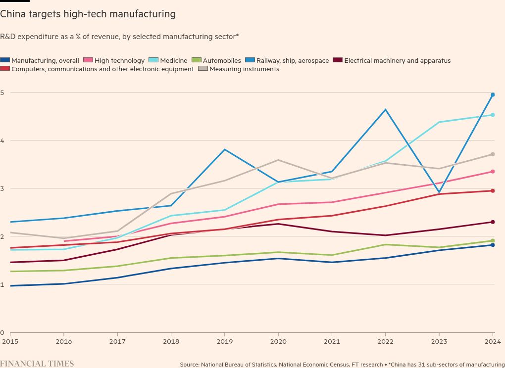 Whereas the biggest focus of US innovation has become potential moonshot technologies such as artificial general intelligence, for Beijing R&D largely focuses on addressing shortcomings in the real economy — part of Xi Jinping’s pursuit of technological self-sufficiency.