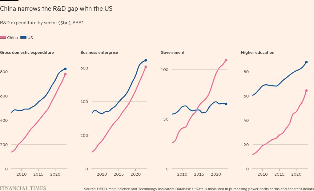Eighty years later, Chinese research is utterly transformed. The country is close to overtaking the US in total expenditure on R&D, with China spending $781bn and the US $823bn in 2023, according to the OECD. It is a stark change from 2007 when China’s R&D spending of $136bn was less than one-third of the $462bn spent by the US.
